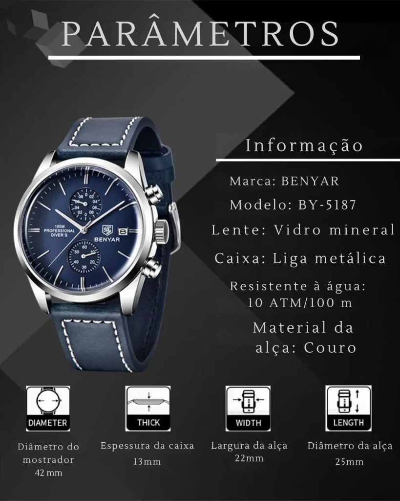 | Conteúdo da Embalagem | Relógio BENYAR • Caixa presenteável • Lenço de limpeza • Cartão de garantia • Manual |