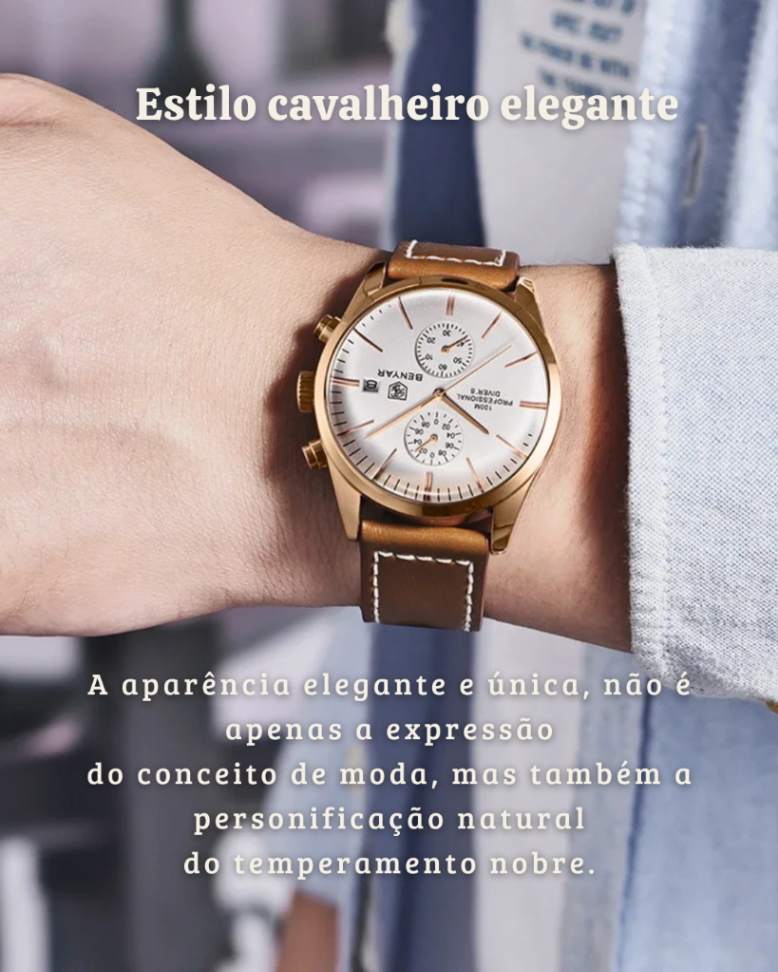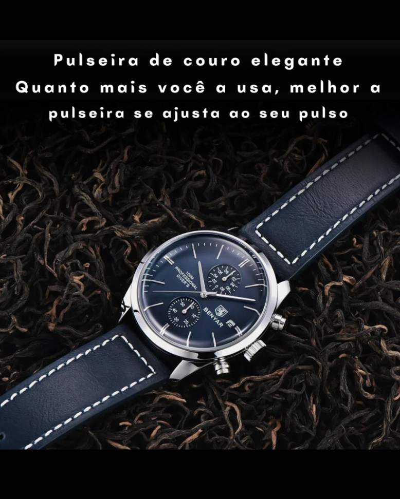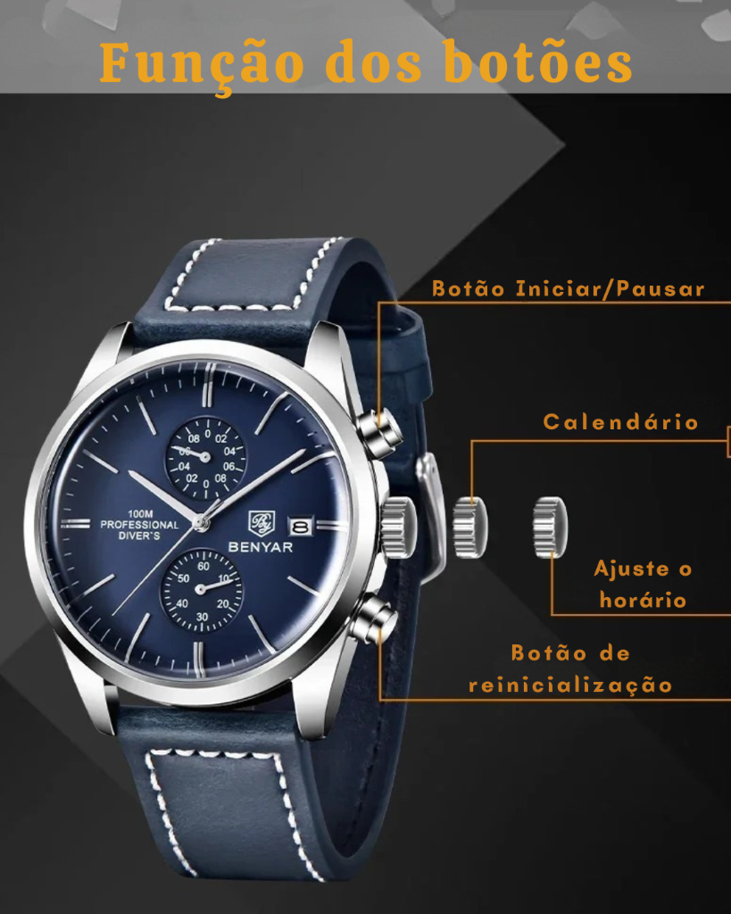 | Recursos | Cronógrafo, cronômetro, data automática, calendário completo, resistente a choques, resistente à água, anti-magnético, ponteiros luminosos. |