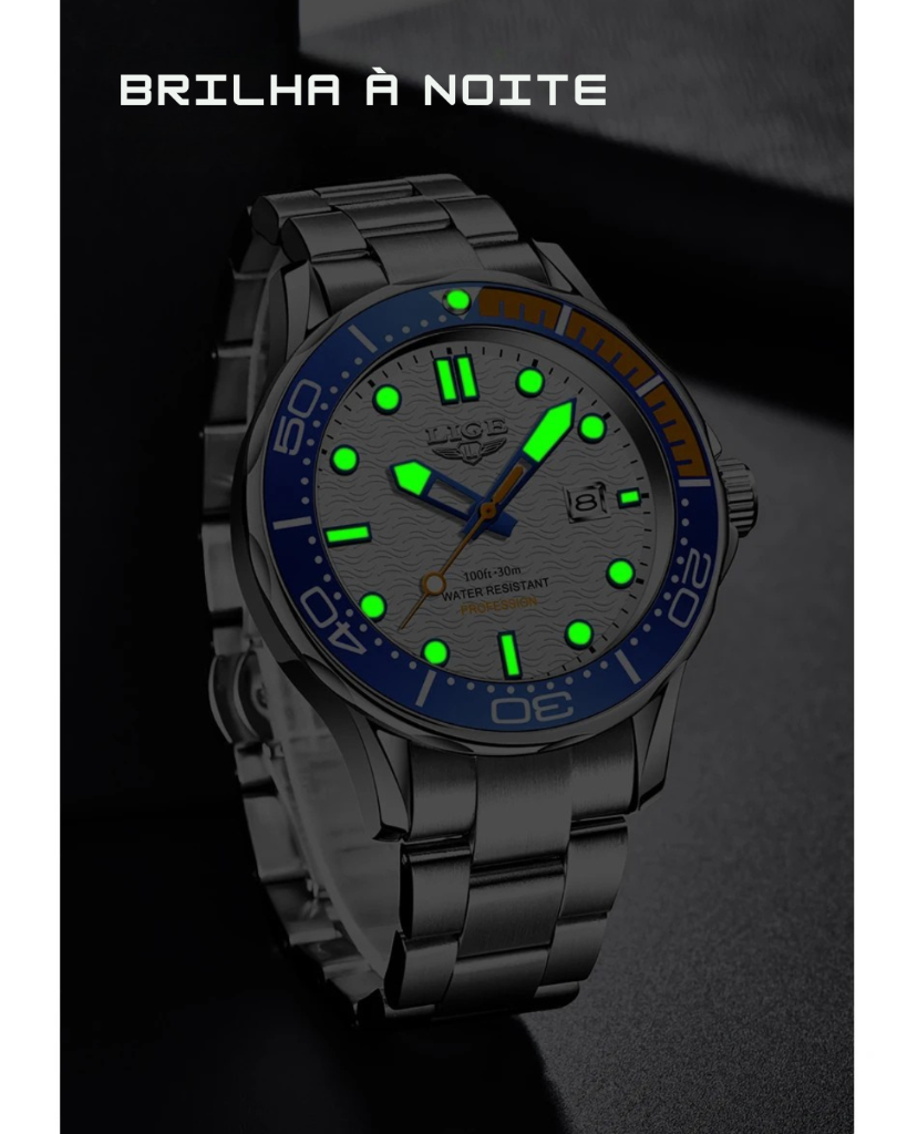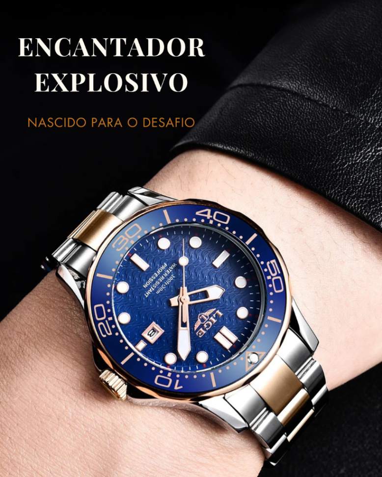 | Funções | Cronógrafo · Calendário completo · Data automática · Ponteiros luminosos · À prova de choque · Anti-magnético · Uso para natação leve |