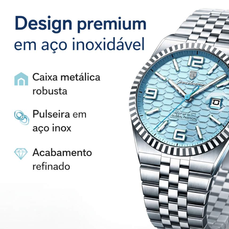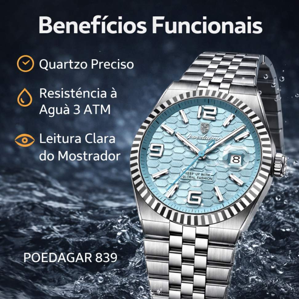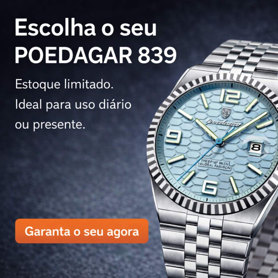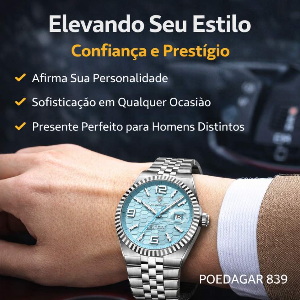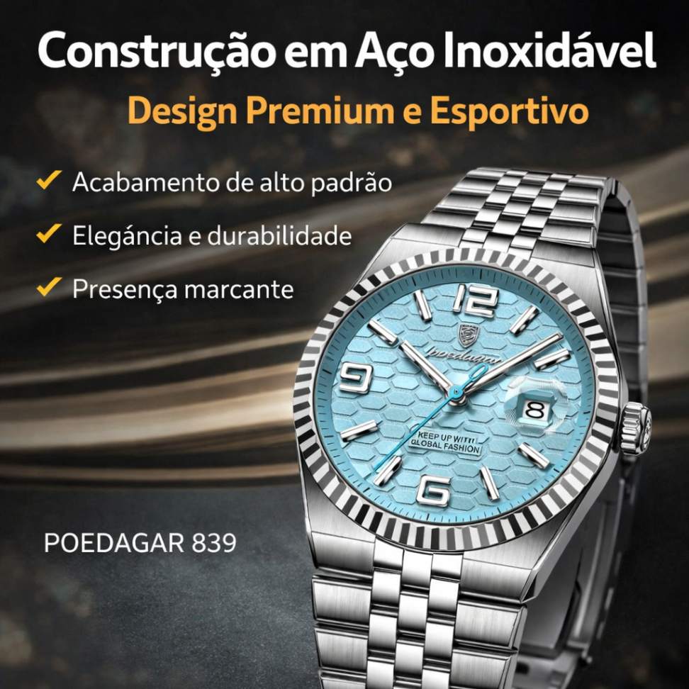 O POEDAGAR 839 combina design sofisticado em aço inoxidável, mostrador de leitura clara e acabamento refinado, sendo a escolha ideal para quem busca um relógio versátil, moderno e confiável para o dia a dia.