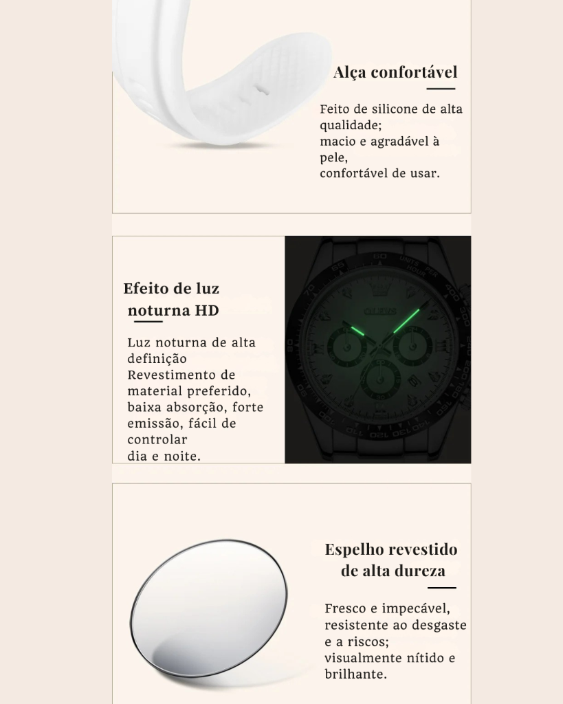 | Funções | Ponteiros luminosos · Data automática · À prova d’água · Resistente a impactos |