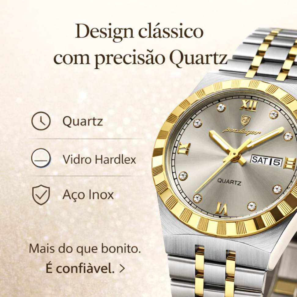 O POEDAGAR 794 combina estética clássica com funcionalidade moderna, entregando um visual refinado e leitura clara para quem valoriza estilo no dia a dia.